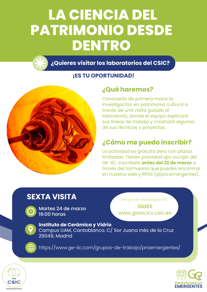 Desde PROemergentes, en colaboración con la Plataforma Temática Interdisciplinar, Patrimonio Abierto: Investigación y Sociedad (PTI-PAIS) del CSIC, seguimos con las visitas mensuales de puertas abiertas a los laboratorios y grupos de investigación en ciencia de patrimonio.